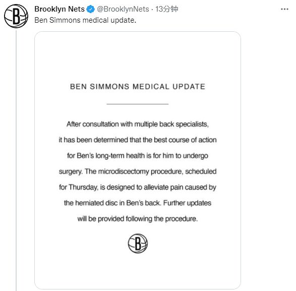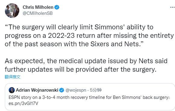 西蒙斯确定接受背部微创手术治疗,沃纳罗斯基透露西蒙斯需要3-4个月的康复期,预计将在9月训练营之前完全康复并且重返球场;该名记还表示手术显然会限制西蒙斯2022-23赛季在球场上的能力。