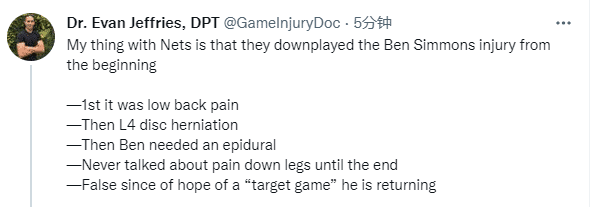 该专家还表示篮网轻视了西蒙斯的伤病,首先是腰痛;然后是L4椎间盘突出,之后接受硬膜外麻醉治疗,直到最后才谈到腿部疼痛,希望他复出只是错觉。