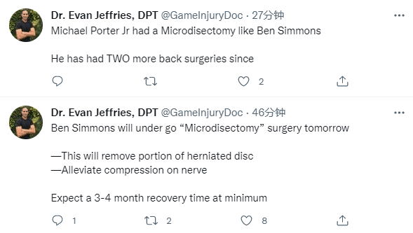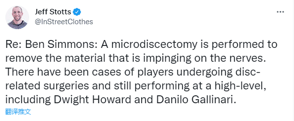 另一医学专家Jeff Stotts发推写道:西蒙斯接受微创切除手术,减轻神经压迫,有些球员接受椎间盘相关手术仍表现出色,比如霍华德和加里纳利。