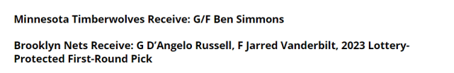 方案二:篮网送出本-西蒙斯,得到森林狼的拉塞尔、范德比尔特、2023年乐透保护首轮签