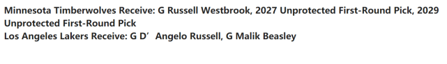 方案一:湖人送出威少、2027年无保护首轮、2029年无保护首轮,得到森林狼的拉塞尔和马利克-比斯利