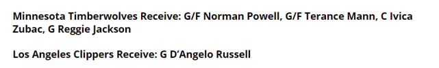 方案三:快船送出鲍威尔、曼恩、祖巴茨和雷吉,得到森林狼的拉塞尔