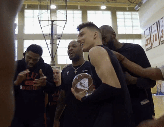 热火老将哈斯勒姆为希罗颁奖,热火全队为他鼓掌、欢呼以及呐喊,希罗全程咧嘴大笑,现场氛围太好了;希罗发表感言:这意味着很多,我接受第六人的角色是有原因的,我想成为联盟的最佳第六人!我目前和未来都处于一个很好的位置。