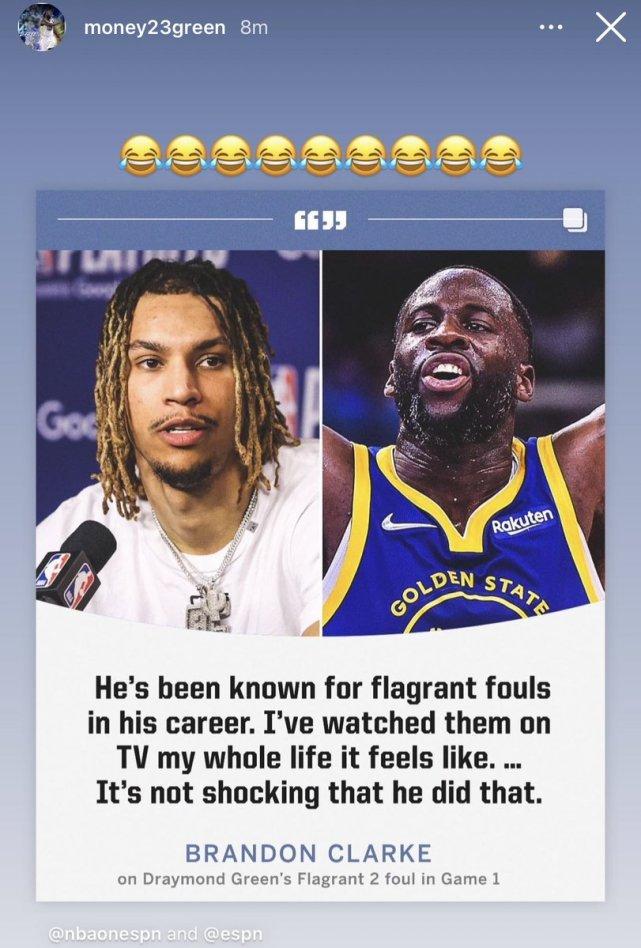G1的比赛,勇士117-116险胜灰熊,比赛第二节,格林在一次防守中拉拽克拉克的球衣,导致后者摔倒在地。当值裁判回放后将格林的犯规升级为二级恶意犯规,直接驱逐出场。