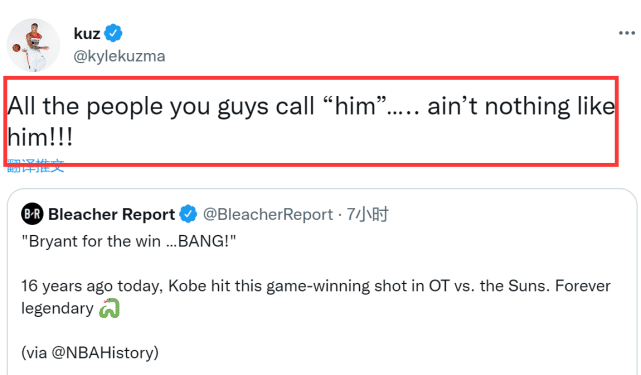 来源:JRS直播网05-02 15:26JRS直播网05月02日讯 16年前的今天,也就是2006年5月1日,湖人与太阳的季后赛首轮G4,科比常规时间最后时刻上篮实现绝平,紧接着在加时赛用一记压哨跳投绝杀对手。奇才球星库兹马今天在社媒上转发了科比双绝杀视频,并写道:那些所谓的“科比接班人”一点也不像。
