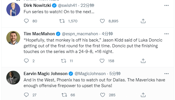 独行侠名宿诺维斯基发推写道:有趣的系列赛,继续观看下一轮;湖人名宿魔术师恭喜独行侠、基德和东契奇晋级西部半决赛,还发推写道:在西部,太阳要小心独行侠,他们有足够的火力来扰乱太阳。