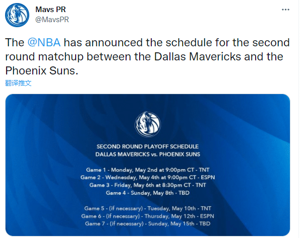 独行侠将在第二轮大战太阳,具体赛程已经出炉