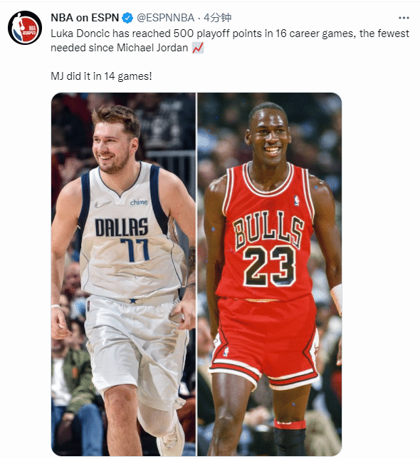 东契奇季后赛总得分达到523分,仅用16场便解锁季后赛500分里程碑,史上仅有乔丹(14场)比东契奇所用场次更少,比肩乔丹达成壮举;今日一战,独行侠上半场打得十分被动,但第三节东契奇带队疯狂反扑,末节持久拉锯战,但生死时刻康利走步违例,博扬错失绝杀,最终独行侠笑到最后。