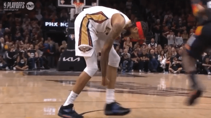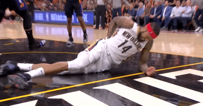 末节4分01秒,英格拉姆底线持球突破,过掉克劳德之后强硬上篮,在空中被艾顿犯规后重摔倒地,从空中摔下来,背部落地十分危险,英格拉姆捂着背部十分痛苦,所幸莺歌无大碍,站起来后继续执行罚球,并且继续留在场上。