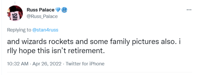 有球迷点评威少的这一反常举动,表态:“希望不要是退役。” 威少虽然本赛季受到不小的打击,但退役的可能性还是不大的。毕竟,他还有一个价值4700万美元的选项,威少不至于傻到这么高的薪水不要了。就算退役,也得等打完下个赛季再考虑。留着雷霆时的照片,难道是想回雷霆?