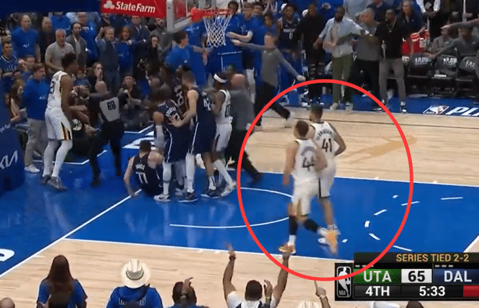 比赛进行到第四节后半段,独行侠已经早早锁定胜局。但爵士不愿放弃,独行侠也没有撤下主力。此时,东契奇强突内线,面对怀特塞德补防,想要顺势来一个隔人暴扣。不过怀特塞德显然不希望当背景板,直接一把将东契奇从空中拉下。