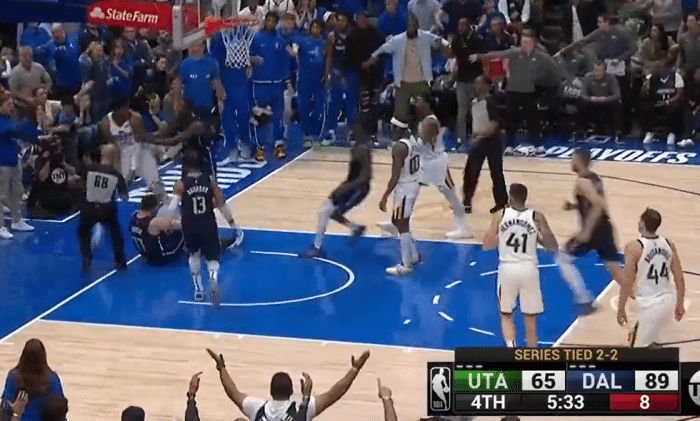 很显然, 怀特塞德这是输急眼之后的表现。而一个细节也正名,爵士球员似乎已经彻底没有心气了。当布洛克和芬尼史密斯冲上前推怀特塞德时,独行侠所有场上球员迅速冲到事发现场,生怕队友吃亏。而爵士一边,只有米切尔第一时间上前,博格达诺维奇和埃尔南戈麦斯不为所动,慢吞吞并不想介入。