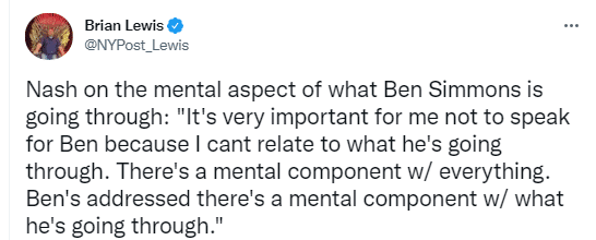 今天纳什又谈到西蒙斯遭遇的心里问题,表示:对我来说,不代表他说话是非常重要的,因为我无法理解他正在经历的事情。