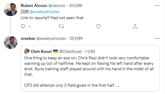 为何保罗突然状态全无?鹈鹕随队记者Oleh Kosel报道,在中场休息时,保罗看起来不舒服,每一次投篮后他的左手都不适;NBA球迷sreekyshooter赛后提到这件事,发推写道:如果关于CP3伤了他的左手并在中场休息时让医务人员检查的报道是真的(他在第四节基本上没有带球),太阳队就完蛋了!这将是非常不幸的!