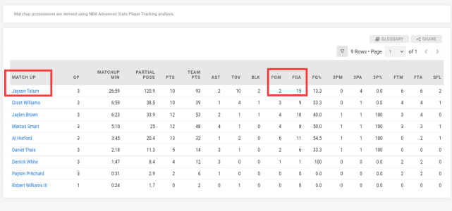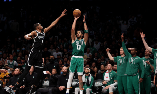 再来看两人的直接对位数据,据NBA官网显示,杜兰特3场比赛面对塔图姆的防守一共15次出手,但仅命中2球!塔图姆是凯尔特人全队单防杜兰特效果最好的球员,KD面对刚刚获得DPOY的斯玛特是8中4。而塔图姆3场比赛面对杜兰特则是18中9,远远超过了自己系列赛场均42.9%的命中率。