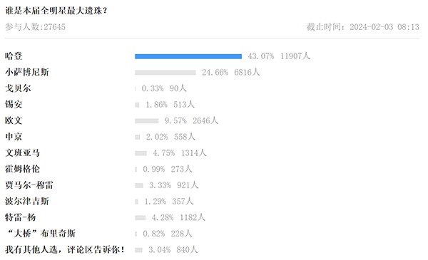根据媒体发起的投票数据显示,连续两年落选的哈登排名第一,小萨博尼斯、欧文等人的得票数也都很高,还有特雷杨、文班亚马等人。其中哈登排名第一,本赛季至今,哈登场均17.2分4.9板8.5助,命中率45.2%,三分命中率41.3%。此前哈登谈到自己是否入选全明星,称能够入选会很开心,没有入选也不会受到影响。