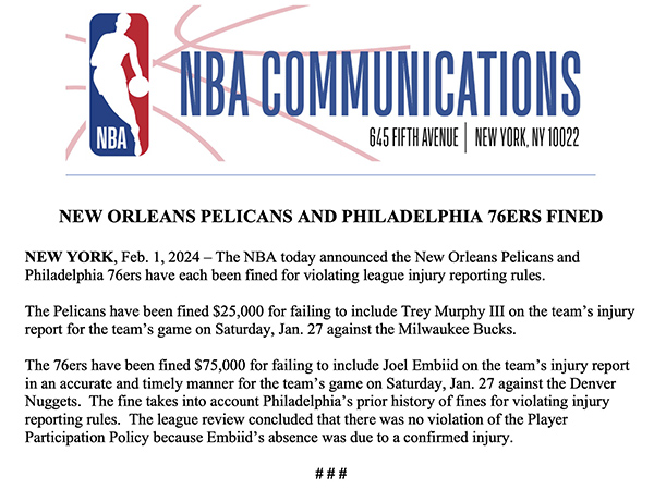 NBA官宣:76人违规被罚7.5万鹈鹕也被罚 公布恩比德临阵退赛调查结果