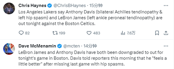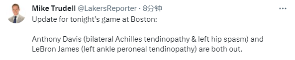 此前詹姆斯和浓眉都因伤被列为出战成疑,距离比赛开打还有5个小时,湖人官方早早宣布詹姆斯和浓眉两大巨星都因伤缺战绿军。