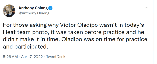 这已经不是奥拉迪波和队内的关系第一次被质疑。就在不久前,热火全队拍摄季后赛全家福,细心的球迷并没有发现奥拉迪波的身影,随后热火记者Chiang表示,全家福拍摄的时间安排在训练前,奥拉迪波没能赶上参加,但他还是准时参加了当天的训练。