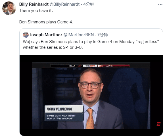 篮网记者Billy Reinhardt发推:西蒙斯会打第4场比赛。