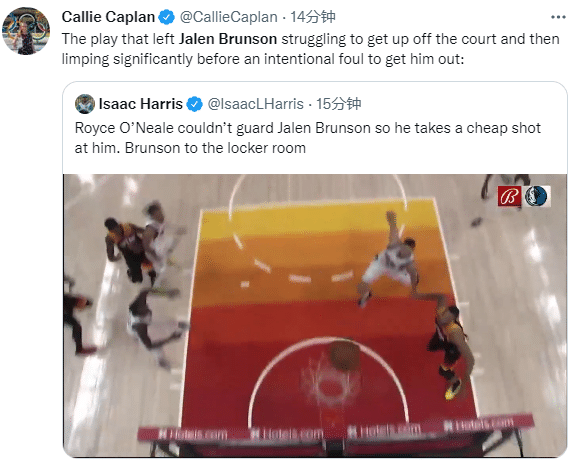 第二节,布伦森在抢板时被罗伊斯-奥尼尔推倒,这球裁判没有任何吹罚,布伦森抱怨判罚吃到技术犯规,布伦森还因被撞倒而受伤离场,捂着腰部一瘸一拐返回更衣室;从现场画面可以看出,爵士悍将奥尼尔的推人动作很脏,有故意伤人的嫌疑。