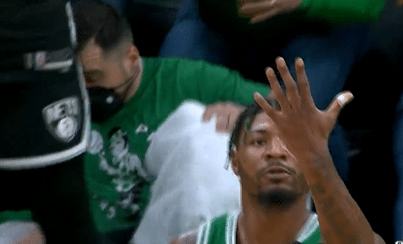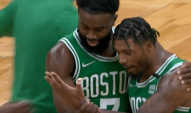 第四节最后阶段,杜兰特两罚全中追分,分差还有8分,这个时候斯玛特接到塔图姆的传球之后突破,他突进去一个勉强的抛投打进,分差重新拉大到两位数,也直接打停了篮网。得分之后的斯玛特看着自己的手,确实很搞笑。而一旁的杰伦-布朗也上来开心的查看斯玛特的手,两人一边走,一边看斯玛特的手,他打进了非常关键的一球。