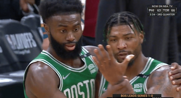 这一幕堪称是杀人诛心,不仅打进了关键球,浇灭了篮网翻盘的气焰,同时还与杰伦布朗上演一起“观掌”的名场面,堪称本轮系列赛的名场面。