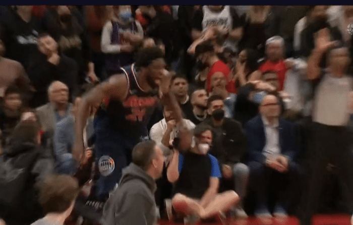 恩比德命中三分球之后,也兴奋地怒吼庆祝,并且跺脚狂跳不止!费城队友们此时也涌向恩比德,向他表示祝贺。替补席上,老里弗斯兴奋挥拳,助教卡塞尔也激情庆祝。而猛龙主场球迷则非常失落,发出巨大的哀叹声。