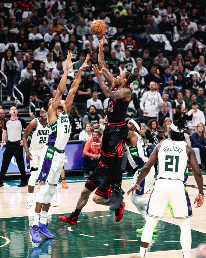 关键时刻,德罗赞干拔被霍乐迪大帽干扰,拉文投进三分,字母哥继续带队追分,德罗赞传球失误,武切维奇三分回应霍乐迪,德罗赞造犯规两罚全中,雄鹿主场很多球迷高呼MVP,德罗赞迎着字母哥打进制胜一球杀死比赛,最终公牛拿下胜利。