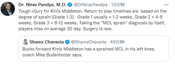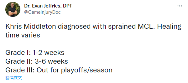米德尔顿很可能因左膝韧带扭伤而缺席很久,医学专家Evan Jeffries列出米德尔顿的恢复周期:一级扭伤缺席1-2周,二级扭伤需要休息3-6周,最严重三级扭伤直接季后赛和赛季报销。