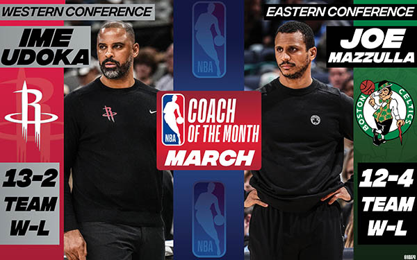 火箭主帅乌度卡和绿军主帅马祖拉分别当选月最佳主帅;在3月份,乌度卡率领火箭取得了13胜2负的战绩,包括11连胜,目前火箭38胜36负排在西部第11位;马祖拉则是率领绿军取得了12胜4负战绩,目前绿军59胜16负稳坐联盟第一。