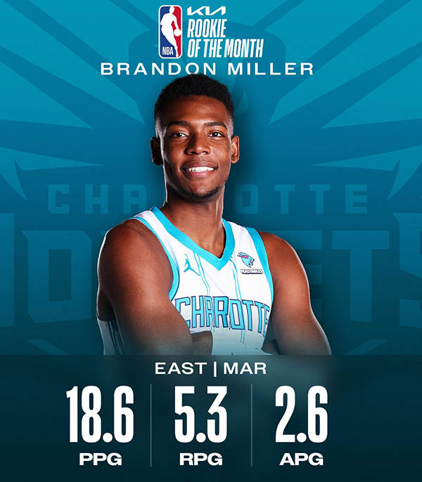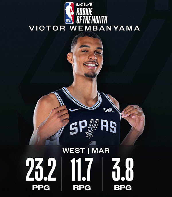 马刺状元文班亚马和黄蜂榜眼布兰登-米勒荣获东西部月最佳新秀,在3月份,文班亚马场均拿到23.2分11.7篮板3.8盖帽,米勒则是场均得到18.6分5.3篮板2.6助攻。