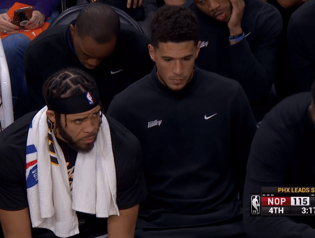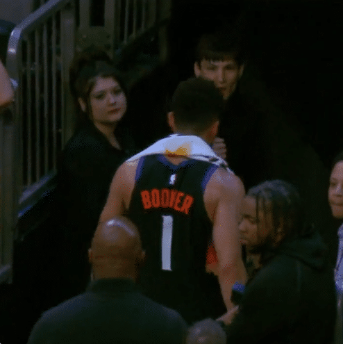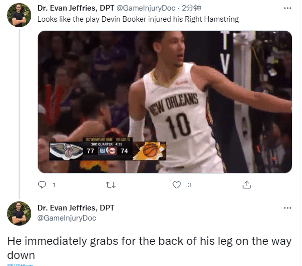 布克受伤画面曝光,Evan Jeffries晒布克追防海耶斯一幕,落地后捂着大腿后侧,这应该就是布克的时刻,之后太阳换下布克,再也没有上场。