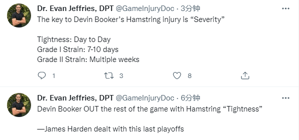 太阳输球,保罗遭14连败魔咒,比这更糟糕的是布克的腿筋受伤了;医学专家Evan Jeffries发推写道:布克因腿筋紧张而退赛,去年季后赛哈登就遭遇腿筋伤势的困扰;预计布克将在明天接受核磁共振检查,轻微拉伤会进入每日观察名单,一级拉伤需休息7-10天,二级拉伤则伤停多周。