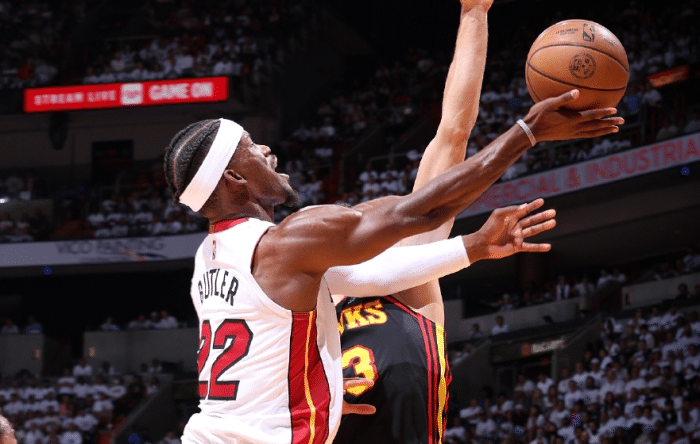 第二节,热火和老鹰继续僵持对决,巴特勒再次轰进三分,突破杀到禁区上反篮,此时洛瑞和亨特发生激烈对峙,互喷垃圾话双双吃T;打着打着,老鹰反超比分,不过两队分差不大,上半场最后129秒,巴特勒里突外投连得7分,助热火半场56-54领先2分。