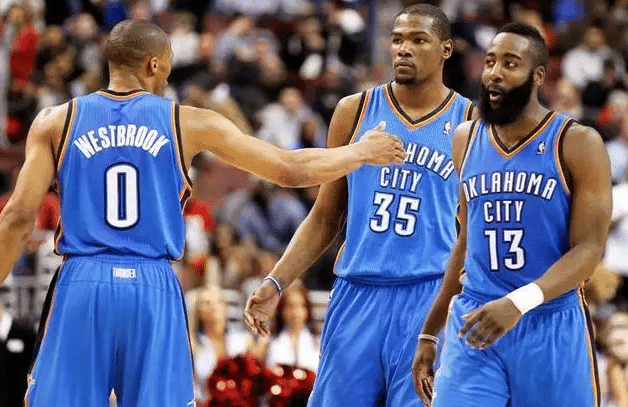 雷霆曾是联盟超级豪强球队之一,当年杜兰特、威少和哈登三巨头一度带队杀进总决赛,无奈当时碰到如日中天的热火三巨头(詹姆斯、韦德和波什),最终雷霆1-4被热火淘汰出局,结果这也成了雷霆三少合作的最后一个赛季。
