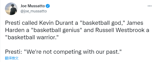 来源:JRS直播网04-19 15:12JRS直播网04月19日讯 ,雷霆总经理普雷斯蒂接受媒体采访,公开盛赞昔日的雷霆三少,直言:杜兰特是篮球之神,哈登是篮球天才,威少是篮球战士,还表示:我们不是在和自己的过去竞争。