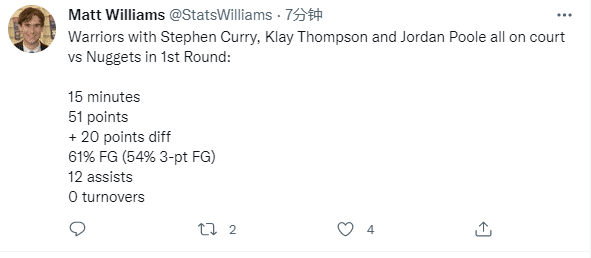 勇士三后卫(库里+汤普森+普尔)同时在场也疯狂至极,据统计,他们同时在场15分钟,勇士轰下51分12助攻且0失误,投篮命中率61%,三分命中率54%。