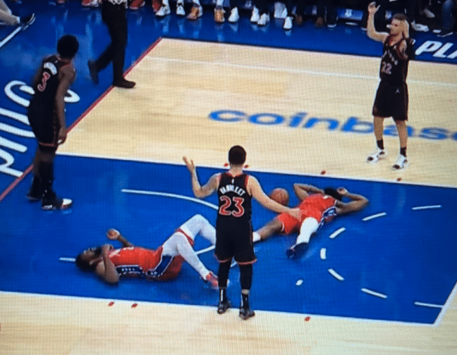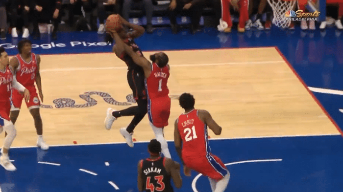 第二节,猛龙进攻明显哑火,第一节独砍14分的范弗利特也失准,反观76人,哈登外线轰进后撤步三分,抢断反击上篮,带领76人单节35-19拉开分差,更是用手背大帽对手,此节恩比德仅出手2次,没有得分进账;上半场最后时刻,哈登撞到颈部,捂着脖子痛苦倒地,所幸伤势无碍,恩比德也倒地,中场休息时一瘸一拐离场。