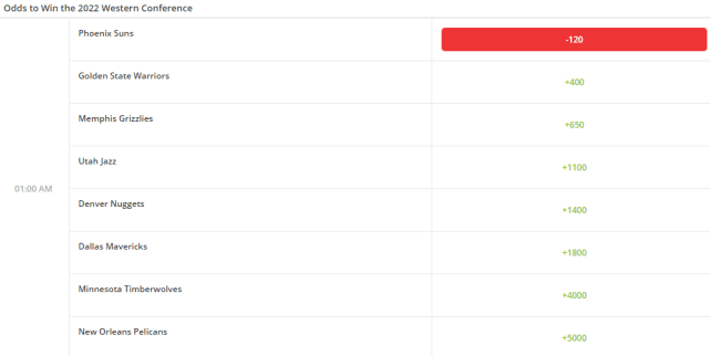 西部冠军的具体赔率和排名如下:1.太阳(-120)、2.勇士(+400)、3.灰熊(+650)、4.爵士(+1100)、5.掘金(+1400)、6.独行侠(+1800)、7.森林狼(+4000)、8.鹈鹕(+5000)。