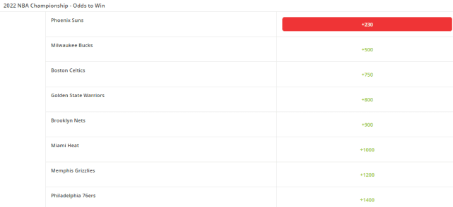 季后赛16队夺冠赔率出炉:太阳领跑勇士第四 篮网第五76人第八