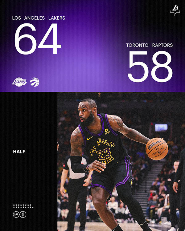 第二节,詹姆斯两次中投打铁后再次频频杀到内线,连续4次强突碾压得分,一挑二晃飞对手后得分造犯规,此时老詹抖肩庆祝,可惜加罚没进;进攻端,老詹助攻串联队友,助攻浓眉以及八村垒暴扣太精彩;湖人长时间掌控局面,可上半场最后150秒,湖人被猛龙打出9-3攻势,半场打完湖人暂时领先6分。