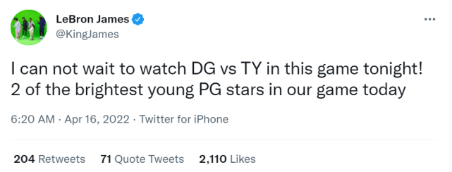 他还在训练后发推:“等不及看加兰vs特雷-杨了!两位最闪亮的年轻控卫之星。”
