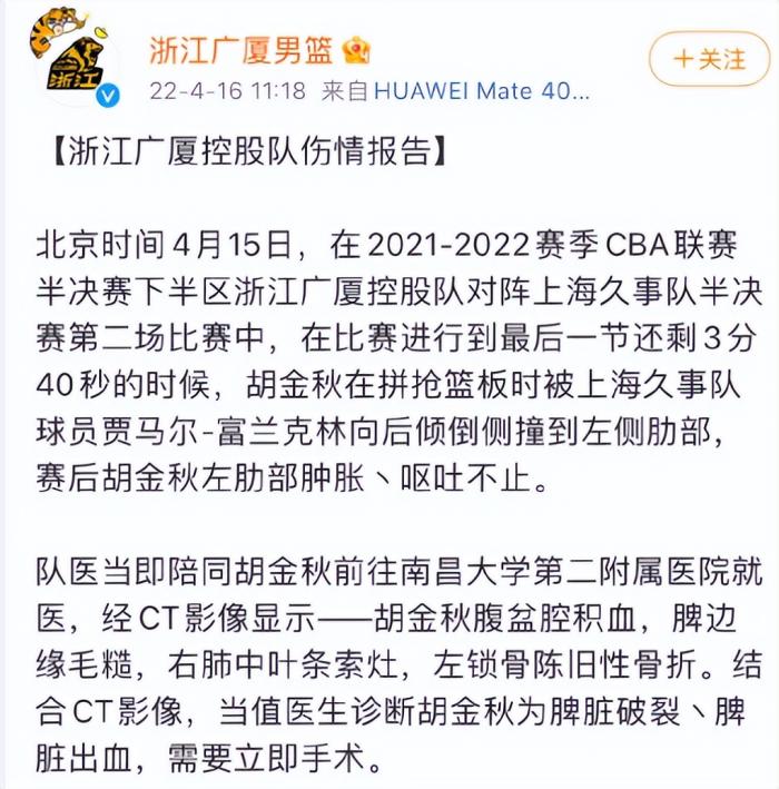 来源:JRS直播网04-16 11:50JRS直播网04月16日讯 ,来自浙江广厦俱乐部官方发布的消息,广厦内线王牌胡金秋在和上海的第二场比赛中受伤离场,而赛后医院给出的检查报告触目惊心!