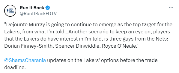 据名记Shams最新报道,穆雷仍旧是湖人的首要目标,在交易截止日前,湖人和老鹰双方的谈判将继续进行;另一个值得关注的情况是湖人队对篮网的三个球员感兴趣——芬尼-史密斯、丁威迪、罗伊斯-奥尼尔。