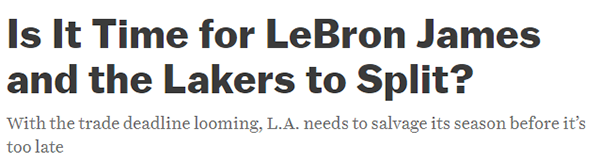 如果湖人和詹姆斯的分手是不可避免的,也许湖人可以在交易截止日前送走詹姆斯,换来一大堆回报,热火、尼克斯、76人会赌上一切吗?他们都可以比湖人更好提供更好的夺冠机会,若勇士可以报价一些选秀权和年轻球员呢?勒布朗确实喜欢库里和追梦格林,或许骑士也会加入其中,离开湖人可以让詹姆斯充分利用他的最后生涯,湖人则可以为未来做准备以及追求东契奇这样的建队基石。