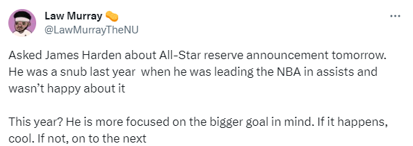 谈到NBA即将公布全明星替补阵容,哈登表示:如果发生了(入选全明星替补阵容),那么很棒。如果没有,那么也不会改变或影响到我。