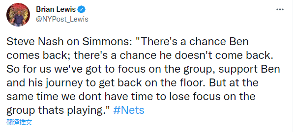 纳什还强调说:西蒙斯有可能回来,他也有可能不回来,所以我认为对我们来说,我们必须首先关注自己这个团队。我支持西蒙斯和他重返赛场的这段路程,但同时我们也不能浪费这些时间,失去对比赛和自身球队的关注。