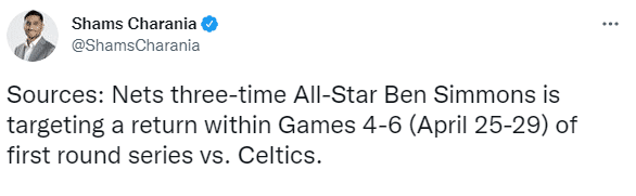 此前名记Windhorst曾透露,西蒙斯的目标是在首轮G4中迎来赛季首秀;赛季至今,西蒙斯因背伤还没有为篮网打过比赛,不过他的背伤已经无碍,并且和球队一起进行投篮训练。
