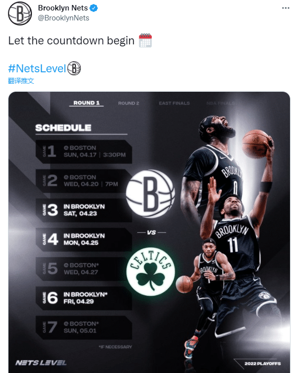 今年季后赛,篮网附加赛击败骑士,最终以东部第7的身份晋级季后赛,首轮大战东部第2的凯尔特人,首轮的具体赛程是——